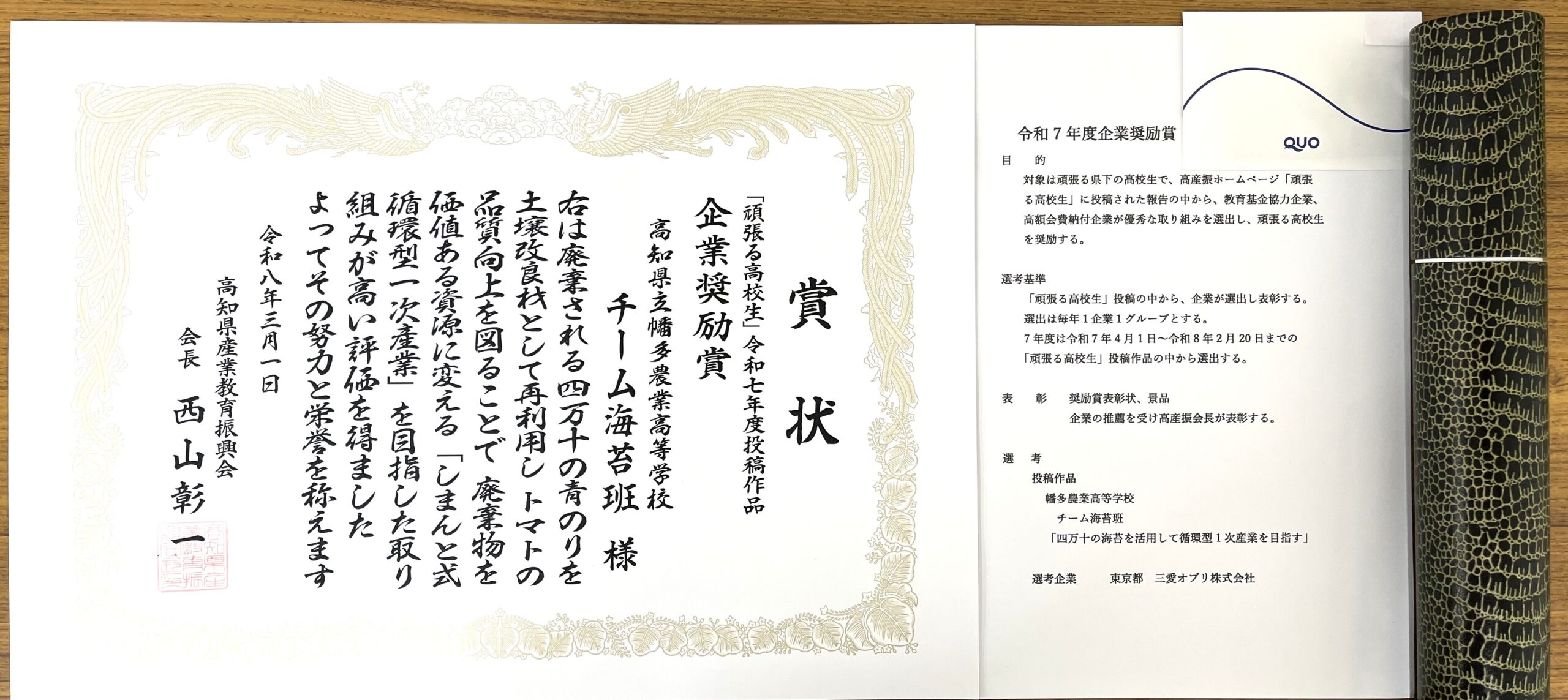 令和7年度頑張る高校生投稿作品企業奨励賞に幡多農業高校チーム海苔班「四万十の海苔を活用して循環型1次産業を目指す」が選ばれました。 選考企業 三愛オブリ株式会社